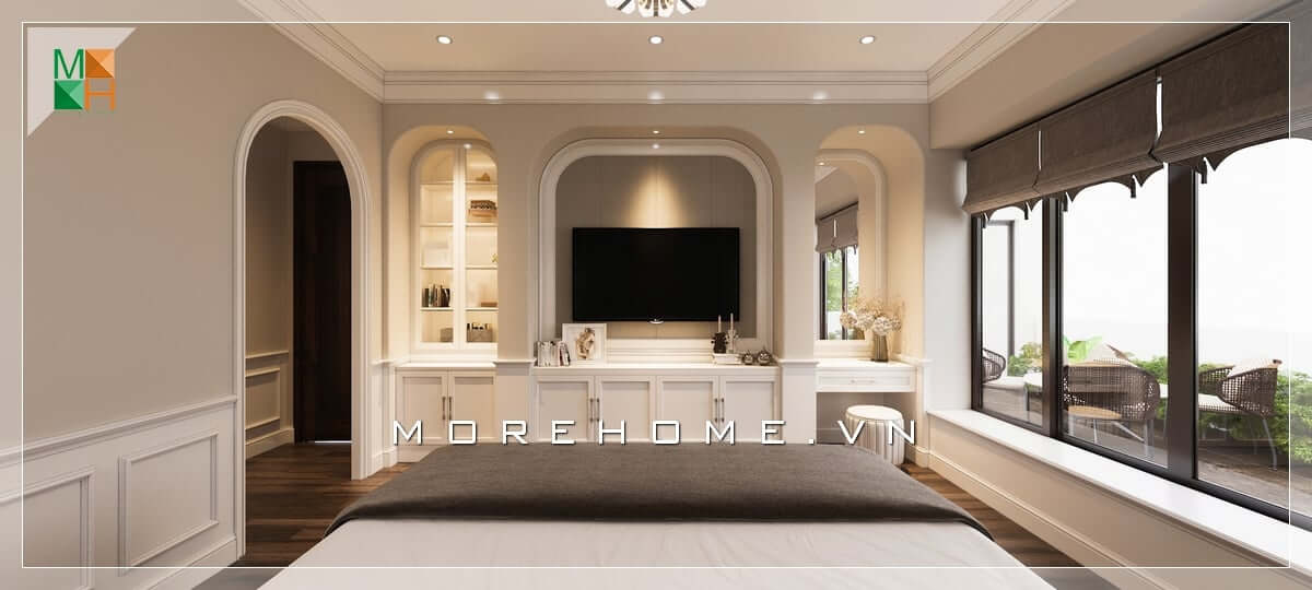 Gợi ý mẫu thiết kế nội thất không gian phòng ngủ chung cư, nhà phố, biệt thự tân cổ điển thông thoáng nhờ thiết kế có cửa sổ lớn.