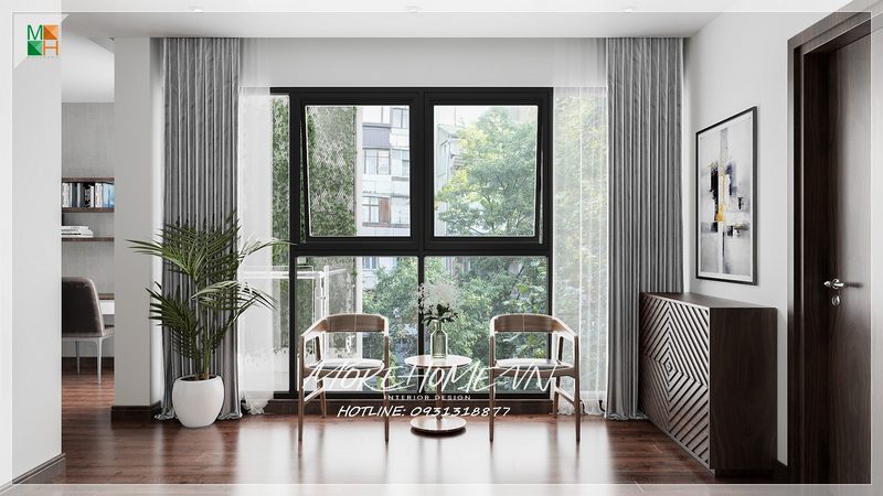 Thiết kế nội thất hành lang chung giữa các căn phòng thành không gian sinh hoạt chung của của gia đình. Bố trí thêm bộ bàn ghế uống trà nhỏ nhắn thanh thoát.