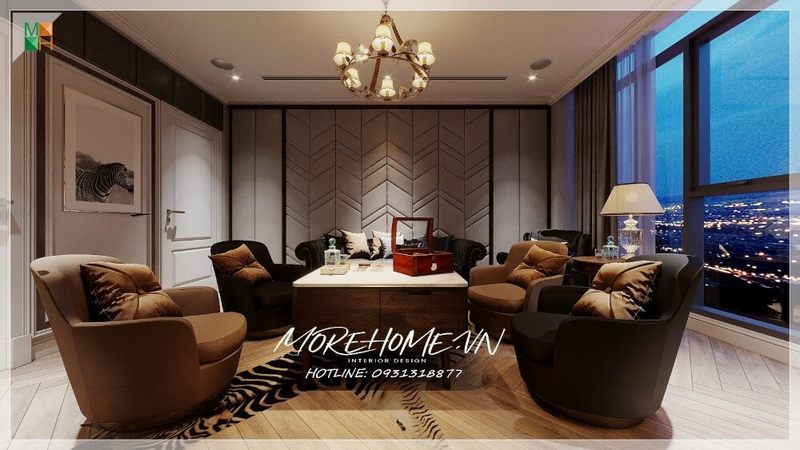 Sofa phòng khách có kiểu dáng hiện đại, được làm từ gỗ tự nhiên và bọc bằng da cao cấp, mang lại sự sang trọng.